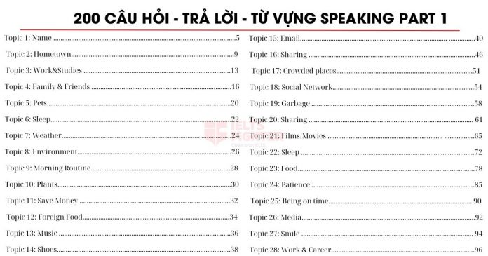 Trong Speaking Part 1 có nhiều chủ đề và câu hỏi đa dạng, bạn đã nắm được bao nhiêu topic? Ở đây có tổng hợp hơn 40 chủ đề hay gặp với câu hỏi phổ biến kèm theo bài mẫu, từ vựng để bạn tham khảo thêm nhé.