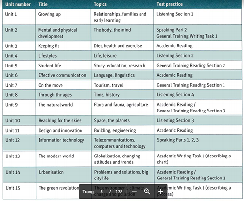 Có 25 bài học được thiết kế từ vựng theo chủ điểm. Những chủ điểm nổi bật mà bạn sẽ rất hay gặp như Relationships, Families and early learning, Health, body, Tourism, Language, Space, Bulding, Telecommunications, Globalisation, Study, Life,….