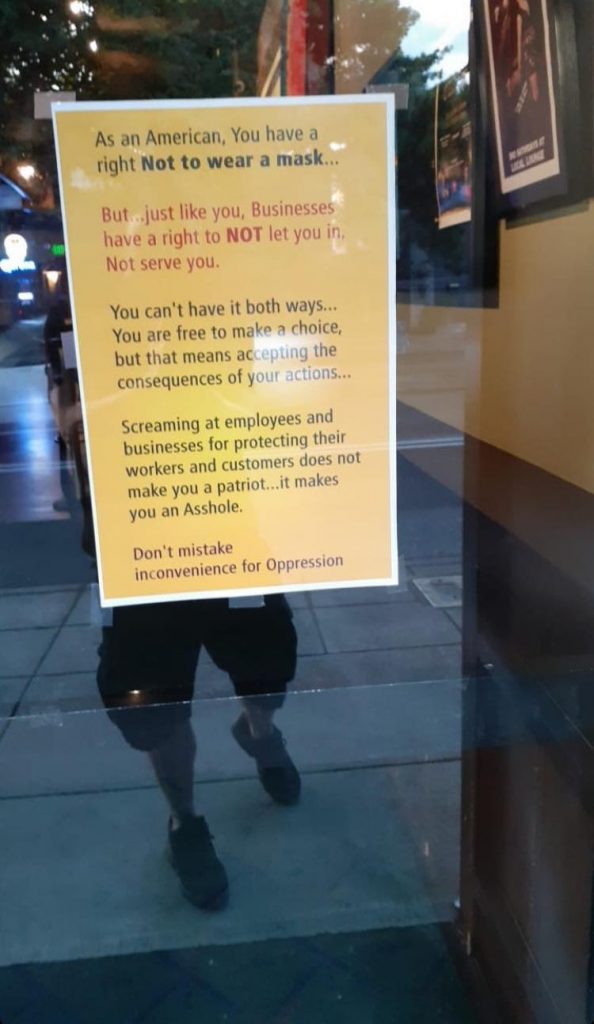 Screaming at employees and business for protecting their workers and customers does not make you a patriot… it makes you an Asshole. Don’t mistake inconvenience for Oppression.