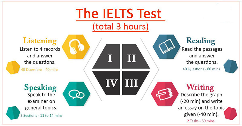 Cấu trúc bài thi IELTS có 4 kỹ năng chia thành 4 phần thi, cụ thể như sau:
