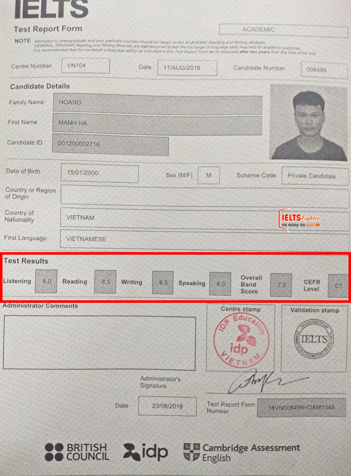 Bảng điểm 7.5 IELTS của Mạnh Hà