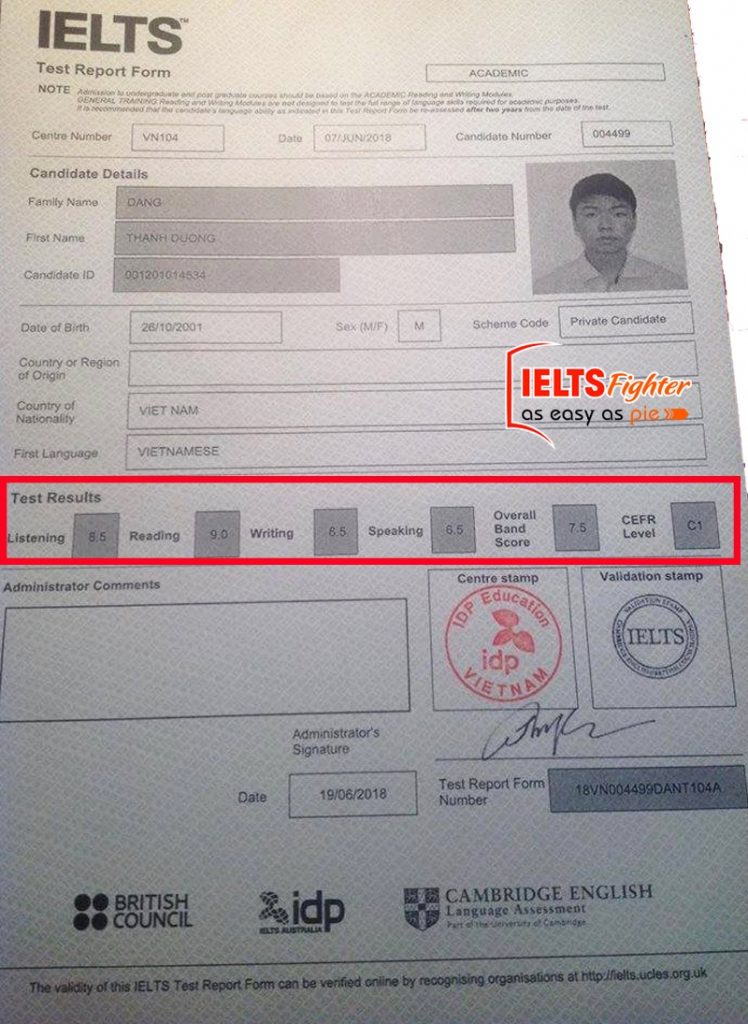 Sau khi kết thúc lớp học khoảng hơn 1 tháng, mình quyết định thi lấy chứng chỉ IELTS. Kết quả thật ngoài sức tưởng tượng: Mình đạt điểm Overall 7.5. Qua đây, mình nghĩ rằng để đạt điểm IELTS cao không quá khó khi bản thân cố gắng hết mình và chọn được trung tâm luyện tiếng Anh hiệu quả và mang lại niềm cảm hứng đối với việc học tiếng Anh.