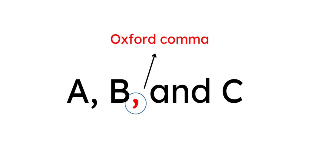 Oxford comma là dấu phẩy cuối cùng trong chuỗi liệt kê, thường được đặt trước ‘and’ hoặc ‘or’. Dưới đây là minh họa Oxford comma: