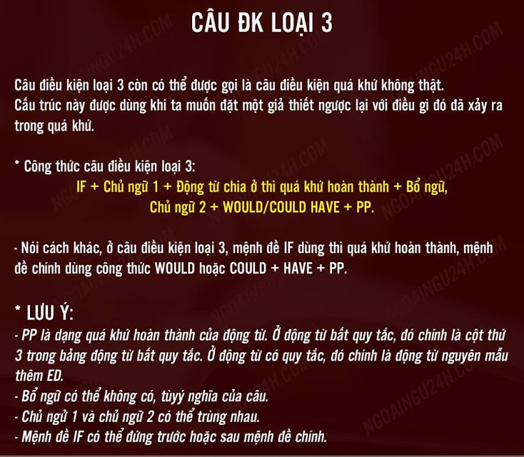 • Để làm được câu điều kiện loại 3, các bạn cần phải nắm kĩ bảng động từ bất quy tắc để chia thì cho đúng.