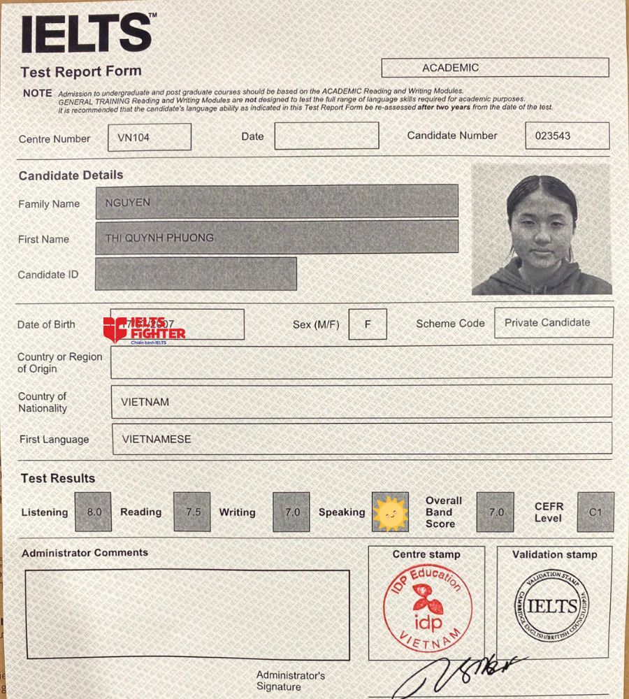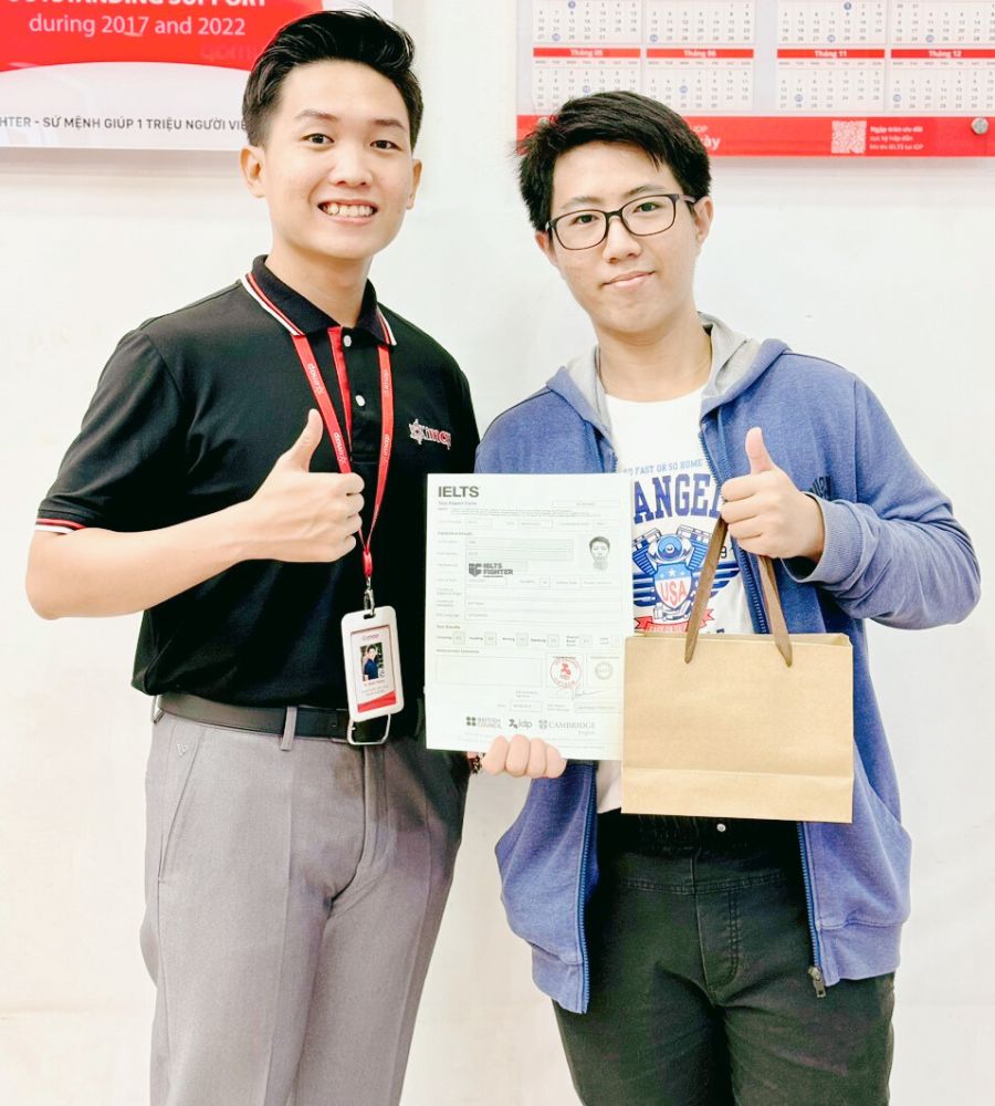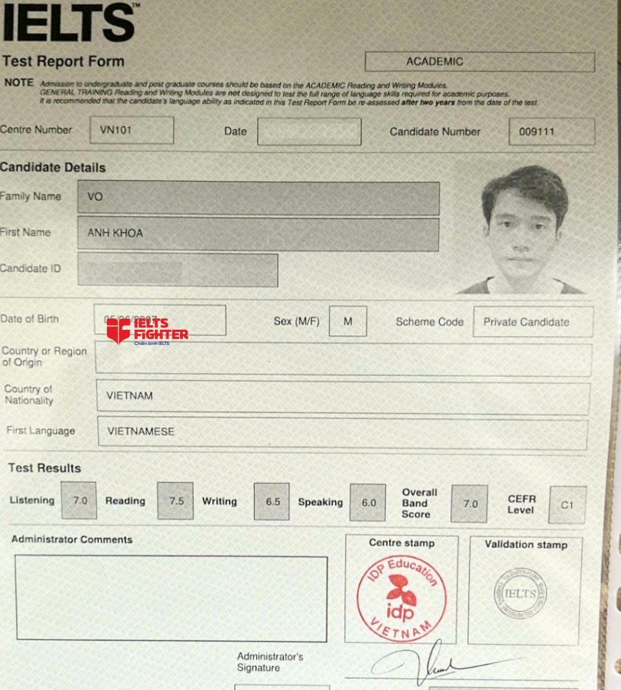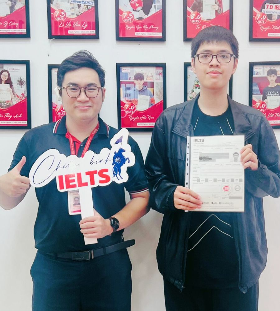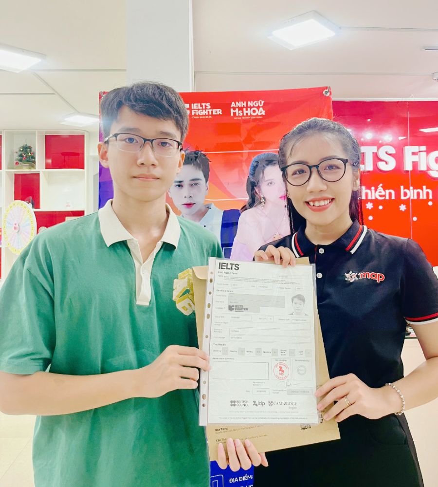 Hi everyone, mình tên là Anh Khoa, học sinh lớp 12 trường THPT Trần Khai Nguyên. Đồng hành với trung tâm được tròn 2 năm, mình bắt đầu từ lớp Basic với số điểm 0 qua các lớp BA30477, PRE33314. PREF36033, F39604, A44603, B53586, LĐ60121, từ hoàn toàn không biết gì về IELTS đến 7.0 overall trong lần thi đầu tiên. Lộ trình học xuyên suốt theo band điểm, chương trình giảng dạy hiệu quả theo phương pháp RIPL của IELTS Fighter và sự đồng hành của thầy cô đã giúp mình đạt được kết quả như ngày hôm nay.