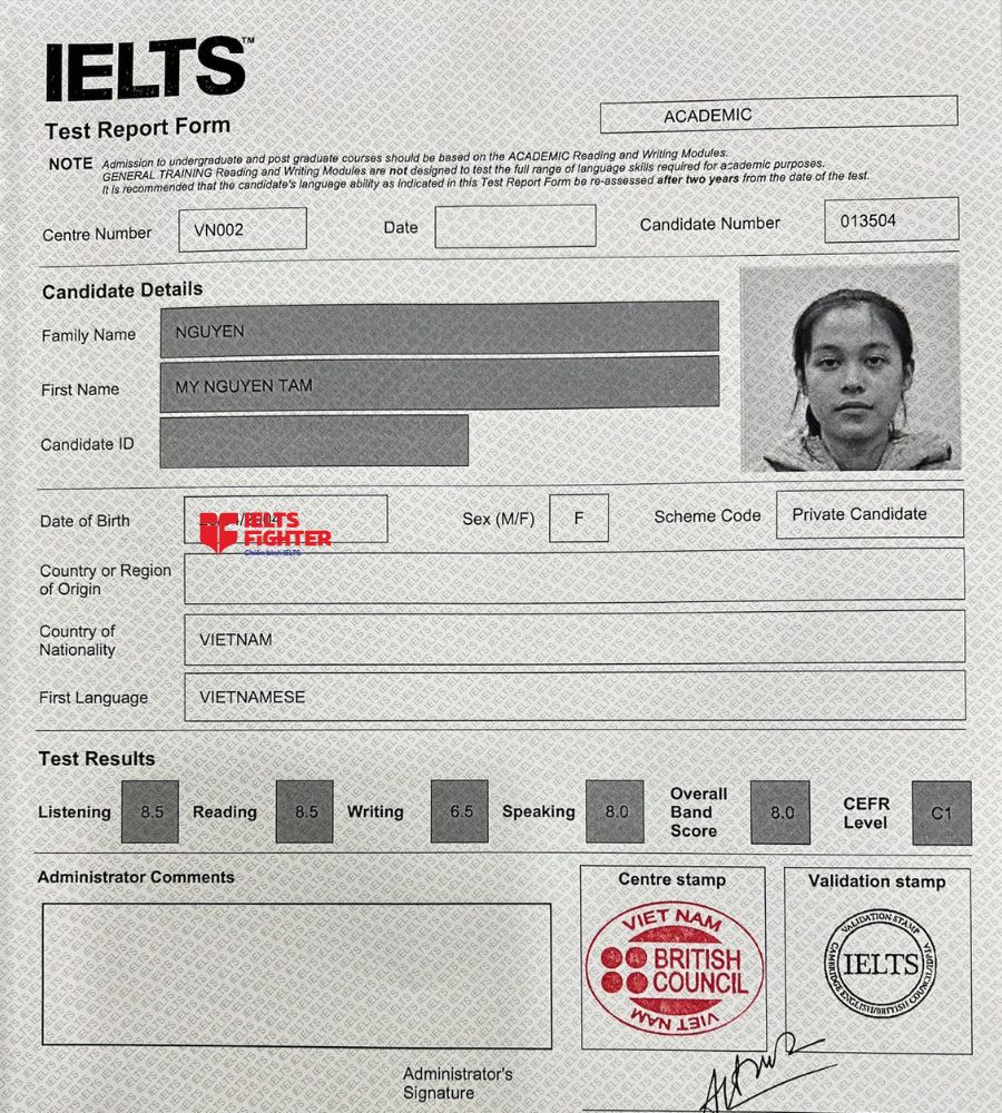 Mình thử egosurfing một chút thì thấy 8.0 là hơn tới 97% người thi IELTS lận đó (sốc quá trời luôn), nhưng mà điều đáng nói là mình học IELTS hoàn toàn không thấy khó một tí xíu nào hết. Có được thành quả như này đều là nhờ vào các phương pháp ôn luyện do IELTS Fighter phát triển cùng với sự tận tâm hướng dẫn của thầy cô tại trung tâm đó.