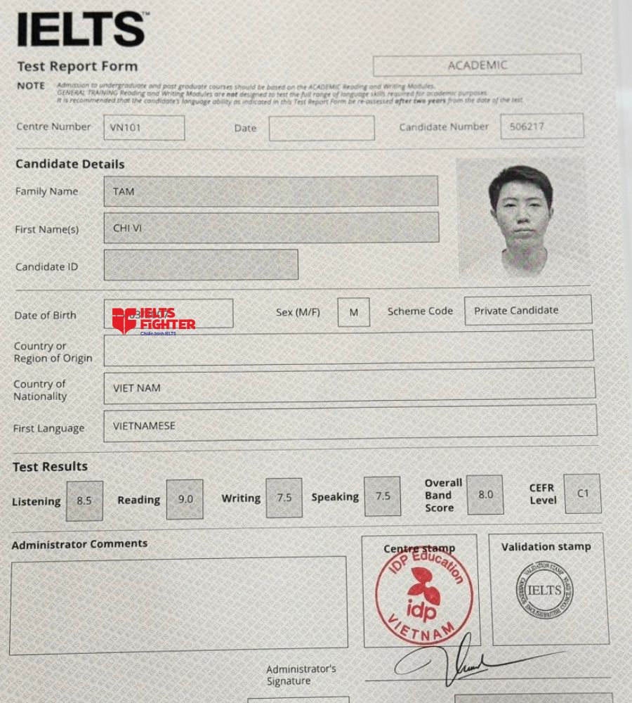 Hê lô mọi người nha, mình là Vĩ và là một học viên của IELTS Fighter Hồ Chí Minh. Mình từng tham gia lộ trình học đầu vào 4.0 với các lớp F32637, A35934 của cô Chi, B42810 của thầy Triều, Luyện đề của thầy Thành. Vừa rồi, mình đi thi IELTS hình thức thi máy tính và chỉ trong chưa đầy 5 ngày sau, kết quả trả về Overall Band 8.0 tròn trĩnh nha mọi người. Mình rất vui ạ.