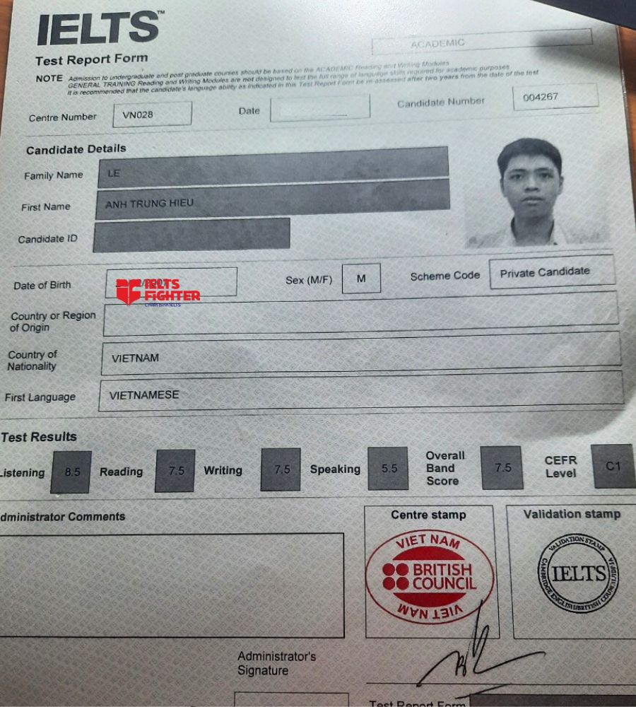 Xin chào mọi người, mình là Trung Hiếu, học viên của IELTS Fighter cơ sở 723 Lê Trọng Tấn. Mình đã hoàn thành lớp BA34046, PRE37761 (thầy Hải Triều), PREF40518 (cô Kim Chi), F43769 (thầy Tuấn Hoàng) , FAIE55455 (thầy Đình Thành) và lớp luyện đề của thầy Vũ Quốc Hải Triều. Ngày 13/6 mình có tham gia kì thi IELTS và đạt được 7.5. Mặc dù hơi tiếc điểm Speaking nhưng mình cũng đã hài lòng với kết quả hiện tại.